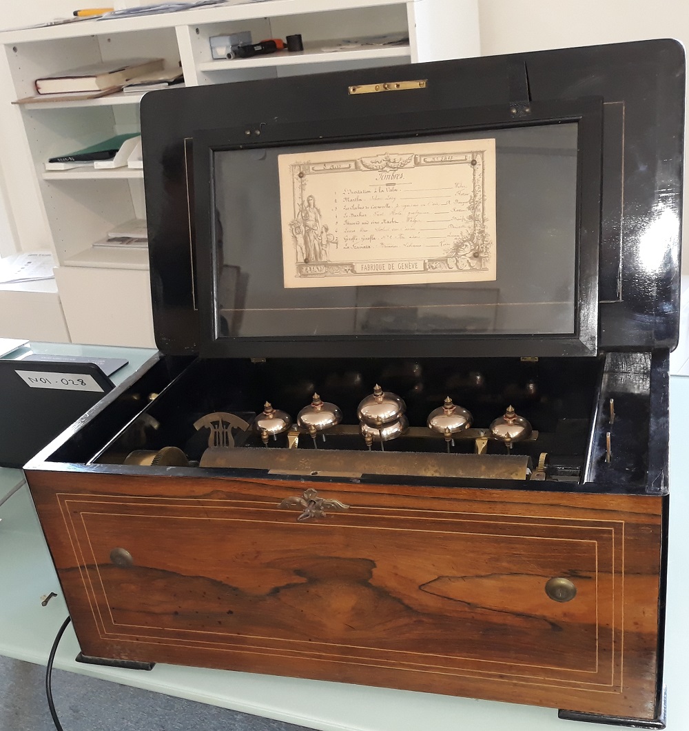 This music Box No. 5457 plays eight airs, on a keyboard of 85 teeth. A subsidiary keyboard of 6 teeth for 6 bells is juxtaposed.