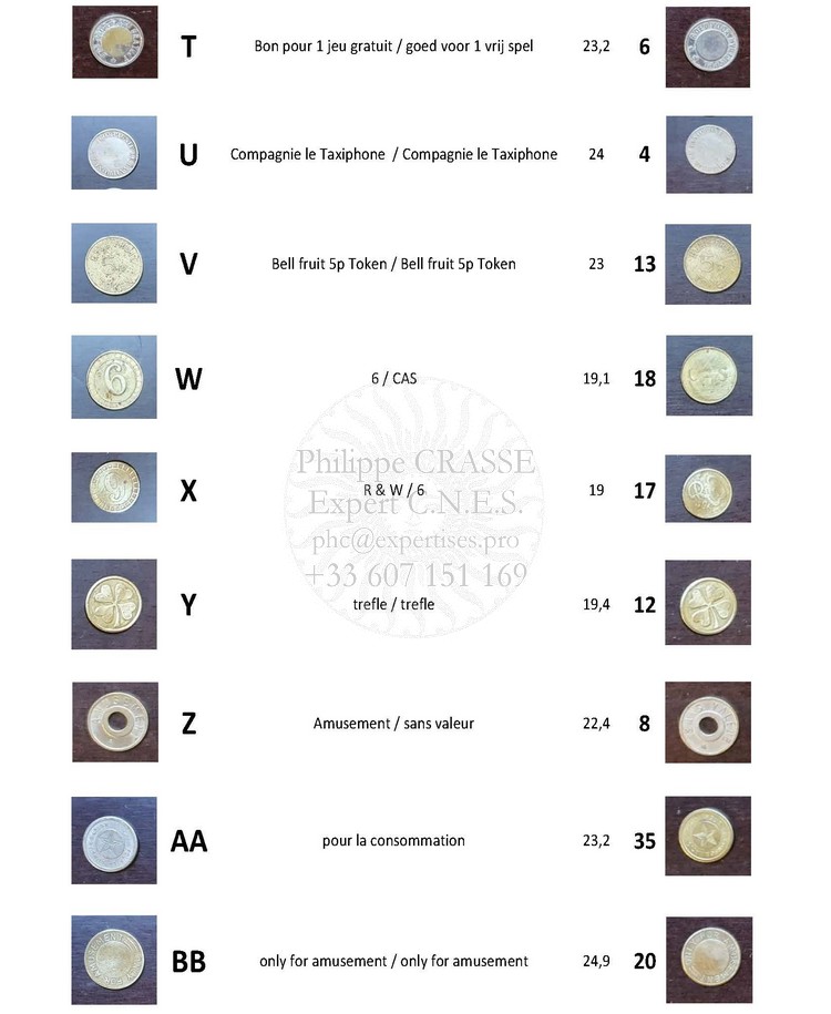 Lot de jetons de machines à sous, jetons-prime ou de jeux forains. Suivant la référence, vous pouvez demander détails, photos HD et prix, en fonction de la quantité. Les renseignements fournis, sont de gauche à droite : avers, notre ref, les textes lisibles sur les deux faces, le diamètre en mm, la quantité disponible et le revers. A vendre en lot ou à l'unité. Provenance : Belgique, France, Grande Bretagne.